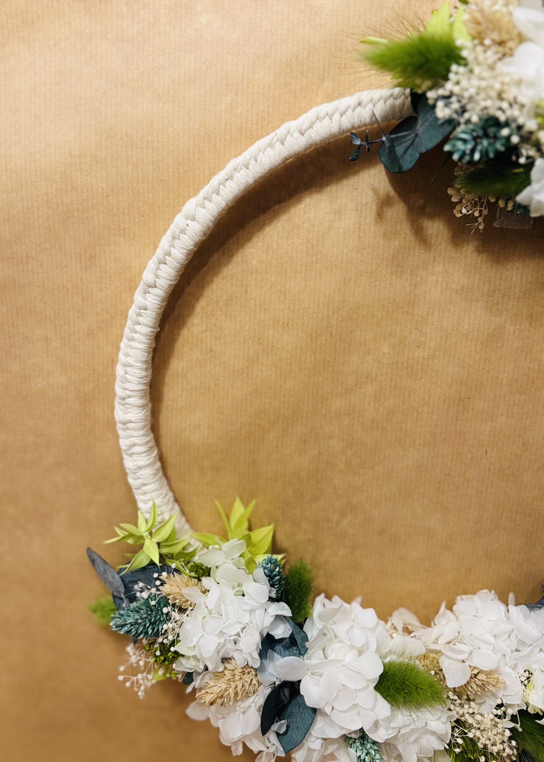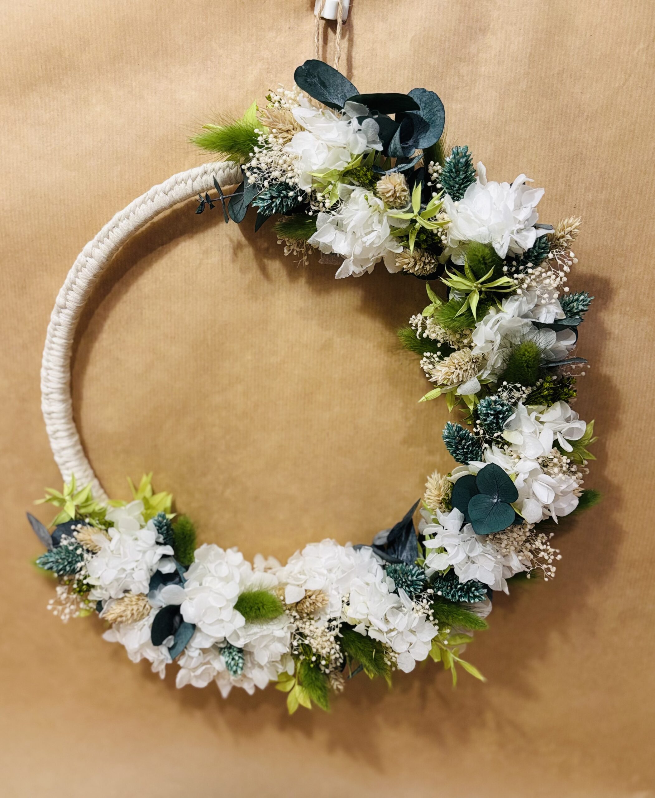 Chaque Couronne florale est une création originale, réalisée entièrement à la main. Son anneau circulaire, enveloppé d’une corde tressée, sert d’écrin à un délicat assemblage de fleurs et feuillages séchés et stabilisés, soigneusement disposés. Le bois travaillé avec passion apporte une touche unique et personnalisée à chaque pièce. Que vous la préfériez dans son état naturel ou avec des finitions spécifiques, chaque Couronne florale est une œuvre d’art à part entière, témoignant de mon savoir-faire.