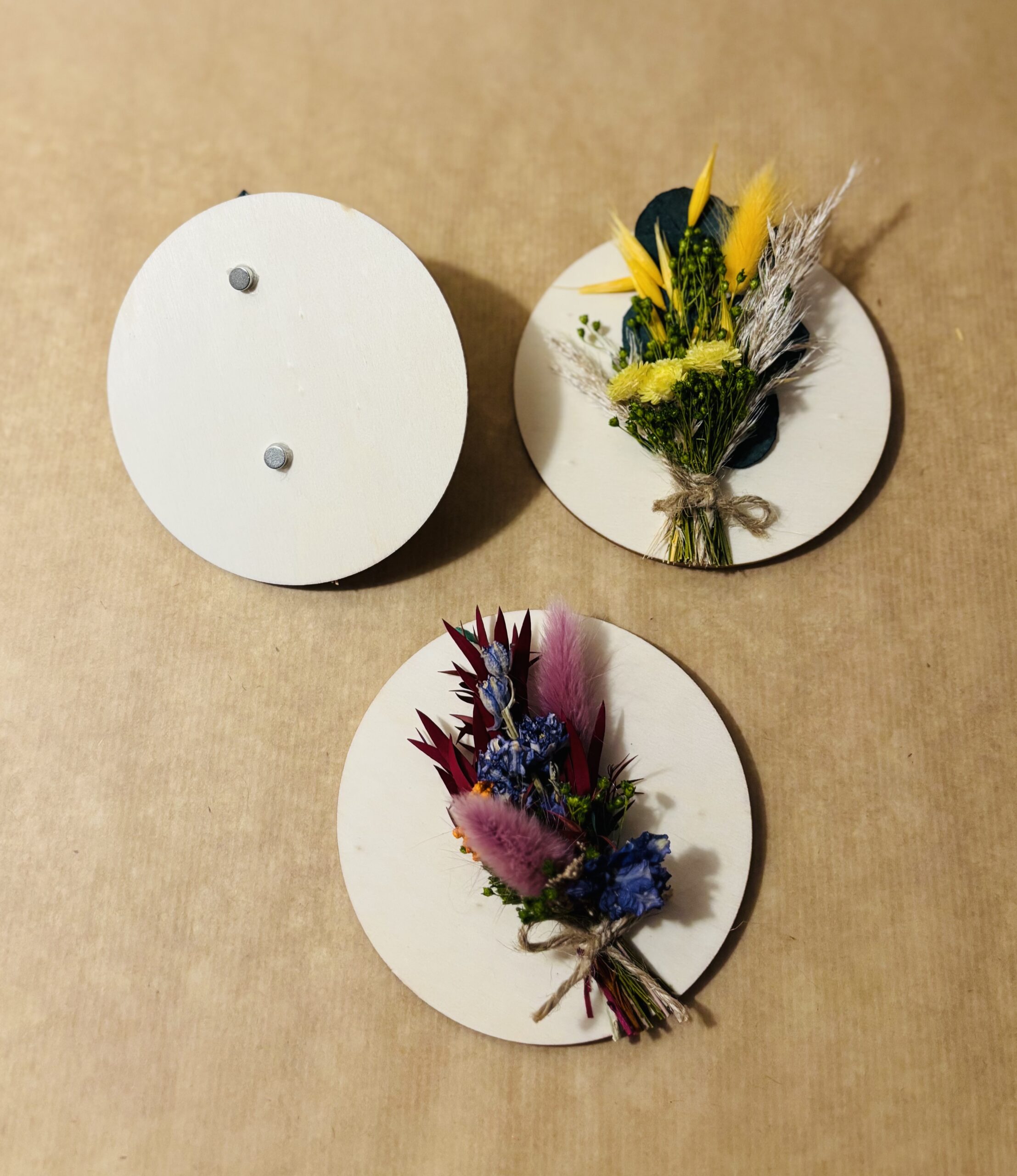 Chaque Magnéto’Fleur est une création originale, réalisée entièrement à la main. Un délicat bouquet de fleurs séchées et stabilisées est soigneusement assemblé, apportant une touche unique et personnalisée à chaque pièce. Que vous préfériez un style naturel ou plus élaboré, chaque Magnéto’Fleur est une œuvre d’art à part entière, témoignant de mon savoir-faire.