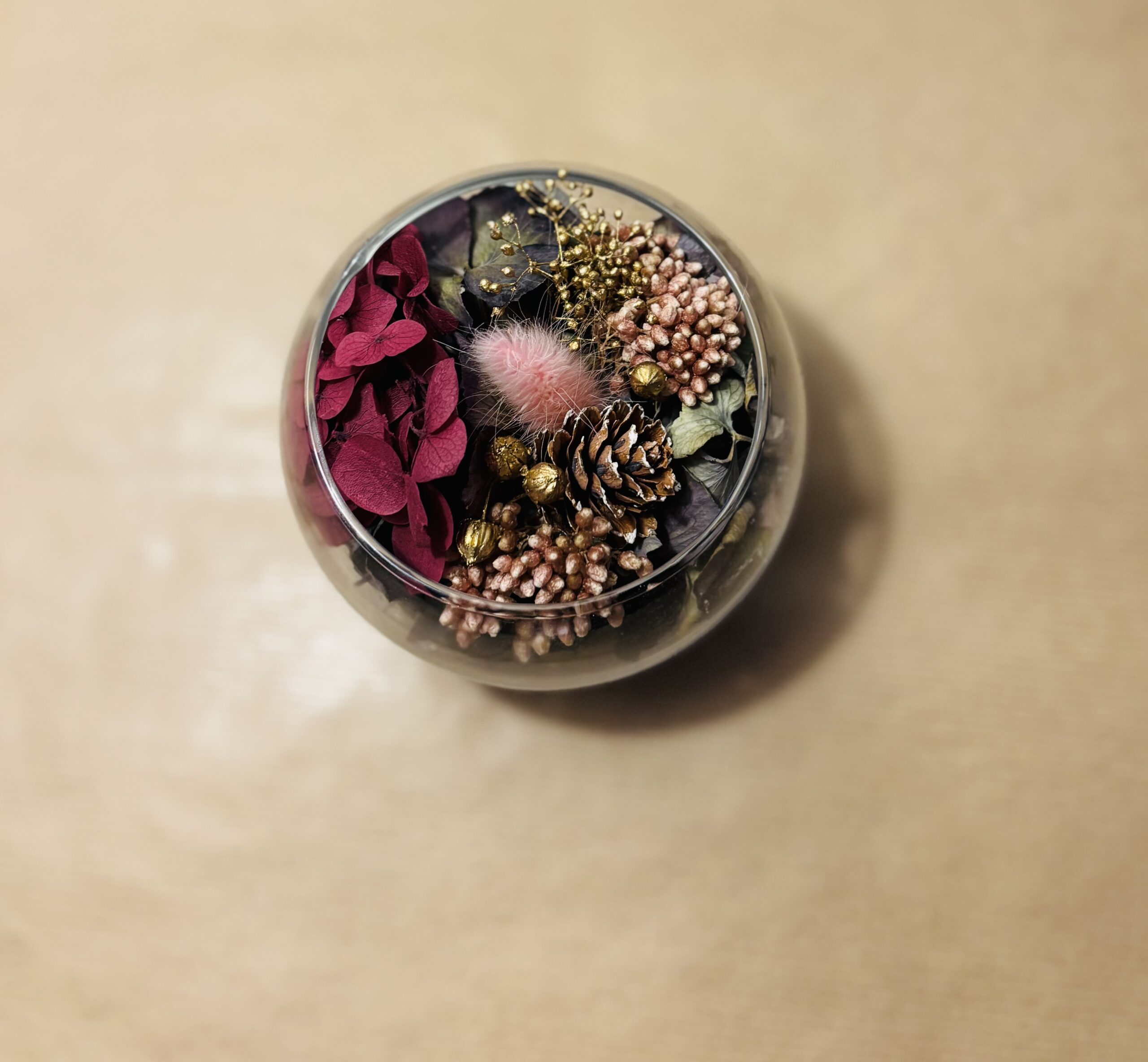 Chaque Mini-Jardin est une création originale, réalisée entièrement à la main. Son écrin de verre renferme un délicat bouquet de fleurs séchées et stabilisées, soigneusement assemblé. Chaque pièce est le fruit d’un travail passionné, apportant une touche unique et personnalisée. Chaque Mini-Jardin est une œuvre d’art à part entière, témoignant de mon savoir-faire