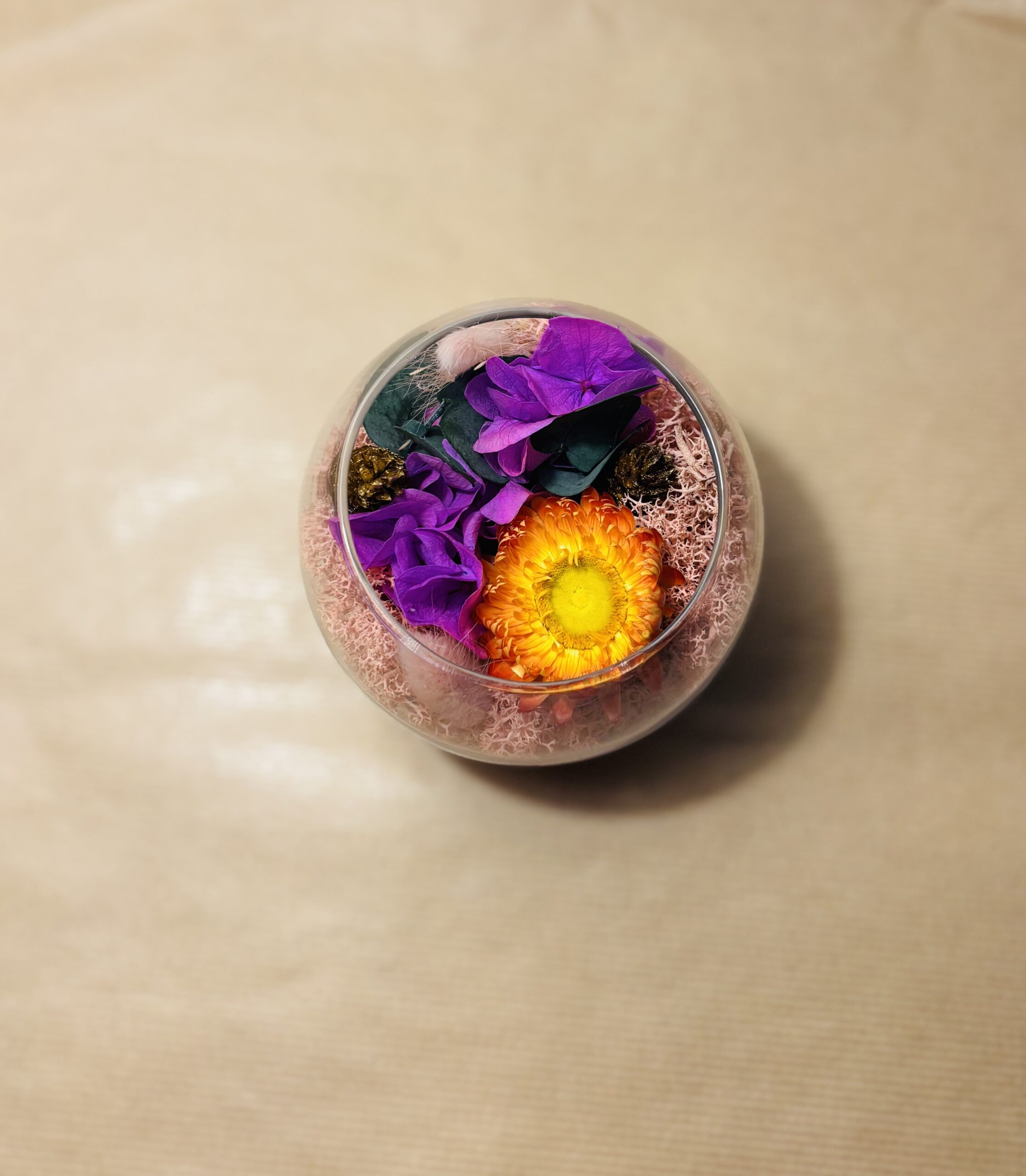 Chaque Mini-Jardin est une création originale, réalisée entièrement à la main. Son écrin de verre renferme un délicat bouquet de fleurs séchées et stabilisées, soigneusement assemblé. Chaque pièce est le fruit d’un travail passionné, apportant une touche unique et personnalisée. Chaque Mini-Jardin est une œuvre d’art à part entière, témoignant de mon savoir-faire